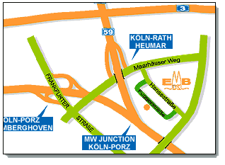 If you travel by the A559 take exit "Gremberghoven". After approx. 100m on the Frankfurter Strasse turn left in the Maarhäuser Weg in the directin of Heumar.