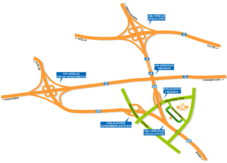 | Von der A59 kommend nehmen Sie die AB-Abfahrt "Köln-Rath / Heumar" und fahren auf dem Maarhäuser Weg in Richtung Heumar. Wenn Sie von der A559 kommen nehmen Sie die AB-Abfahrt "Gremberghoven". Nach ca. 100 m auf der Frankfurter Straße fahrend biegen Sie in den Maarhäuser Weg in Richtung Heumar. Der Straße folgend biegen Sie rechts in die Hansestraße ab, nach ca. 100m biegen Sie rechts in die Fuggerstraße ein. Unsere Zentrale befindet sich nach 300m auf der rechten Seite. |